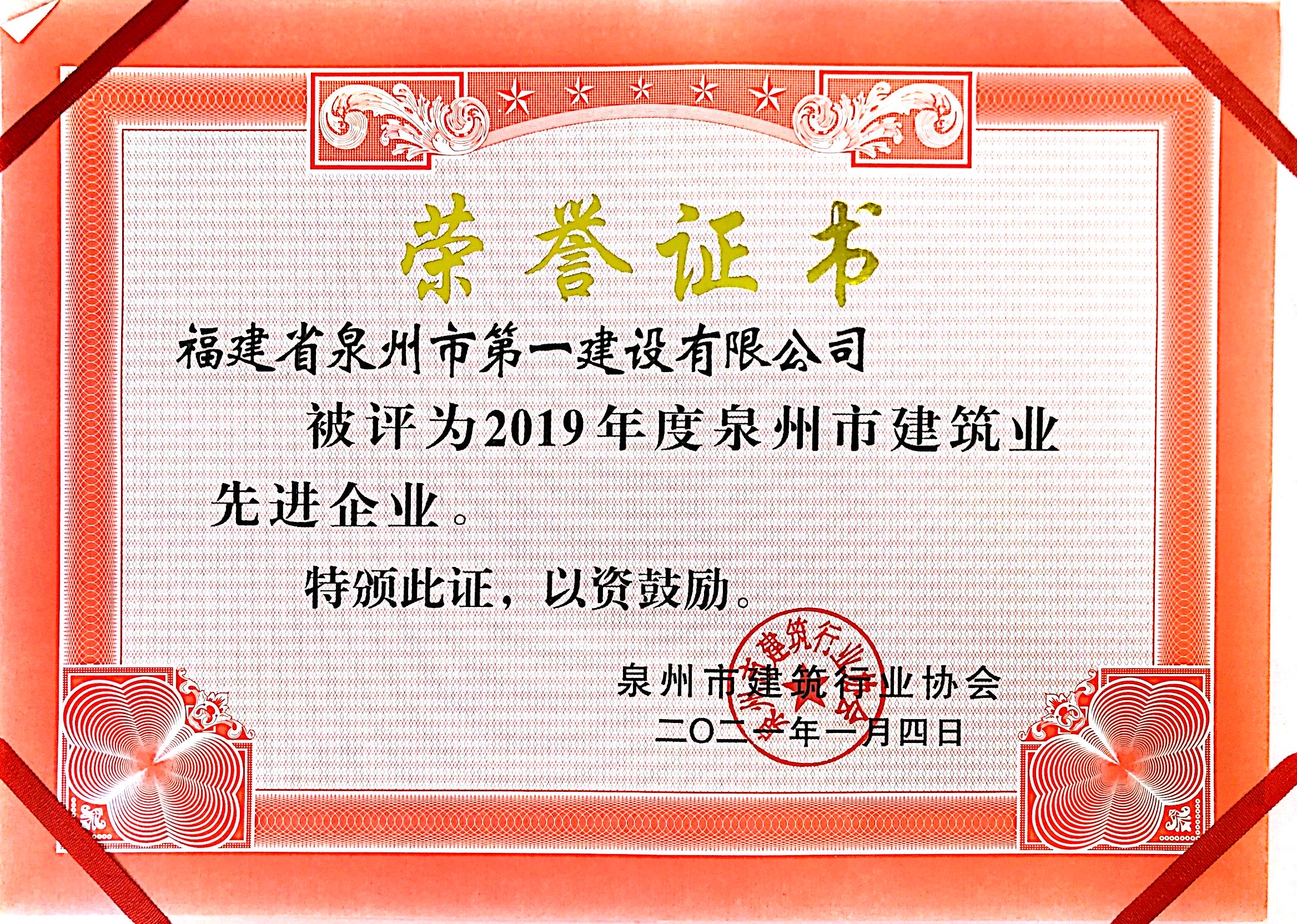 泉州市一建公司獲評2019年度泉州市建筑業(yè)先進企業(yè)